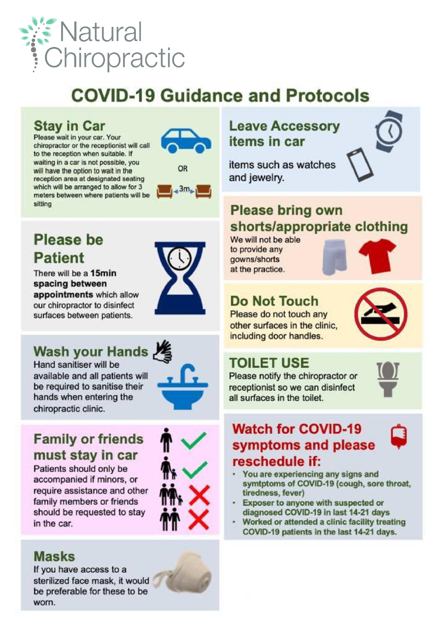 - To reduce contact with anyone other than your Chiropractor, we will only allow one patient in the Clinic at a time. Please ask anyone accompanying you to remain outside/in the car (with the exception of a minor who may need a chaperone).